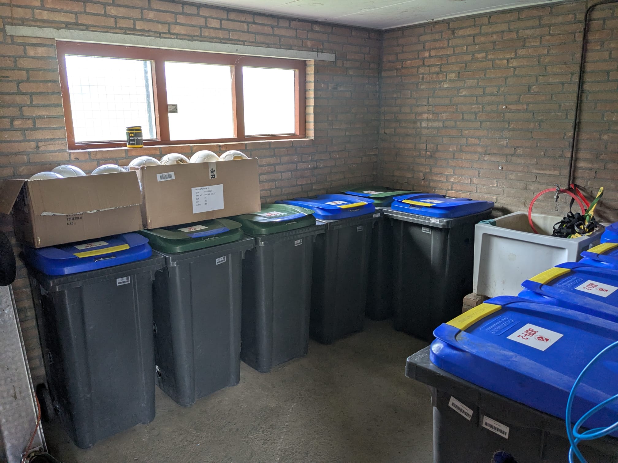 - het ballenhok heeft een flinke make-over gehad, de stalen rekken zijn vervangen door containers.